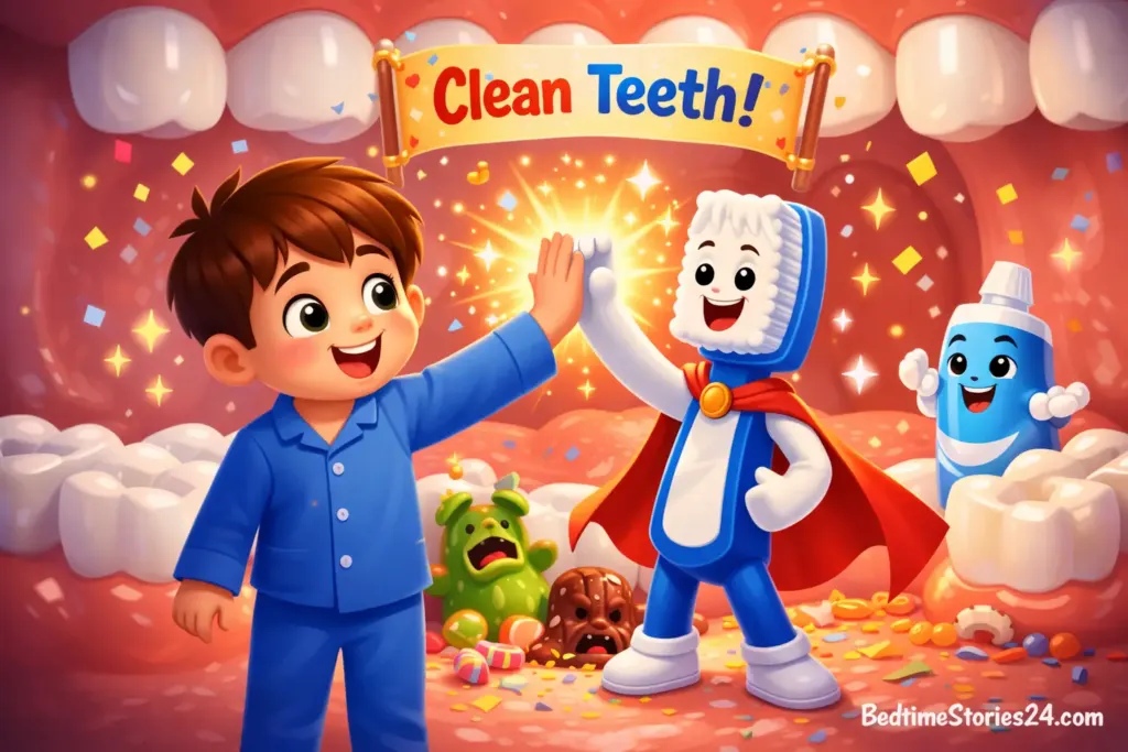 From that day on, Tommy brushed his teeth every morning and every night. His teeth stayed healthy, the Sugar Monsters never returned, and Tommy’s smile made Smileville even happier.