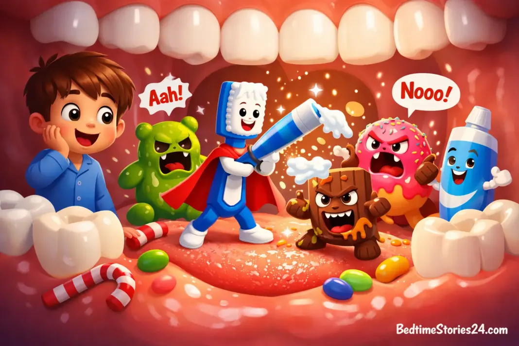 What Tommy didn’t know was that inside his mouth lived tiny creatures called Sugar Monsters. They were small, round, and very sneaky. They loved sugar and hated clean teeth.