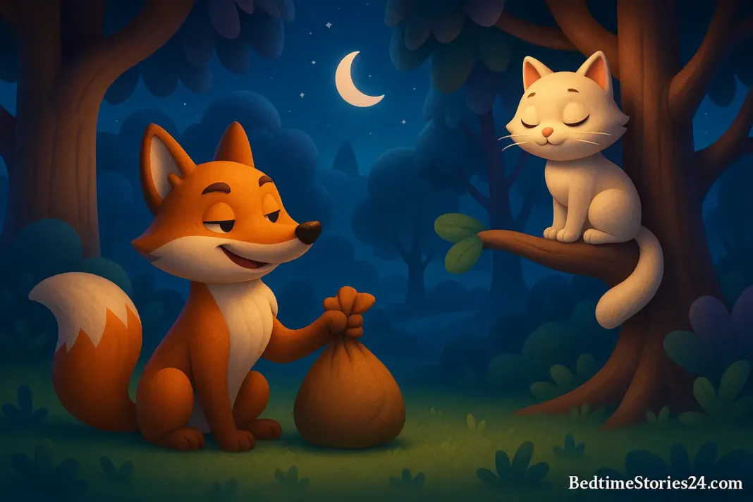 Long ago, in a quiet forest where moonlight slipped gently through the leaves, a clever fox and a calm little cat happened to meet. They sat beneath the tall trees and began to chat as the evening grew still.