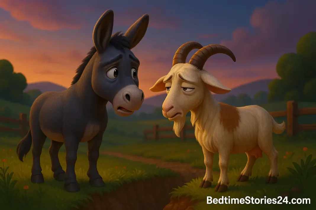 One evening, as the barn settled into silence, the goat sighed and walked over to the donkey. In a soft, sorrowful voice, he said,
