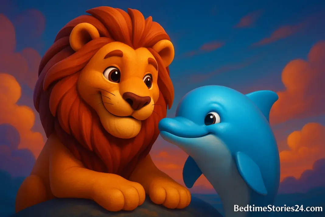 The dolphin paused, letting the waves rock him gently. He knew the lion’s strength on land, just as he trusted his own speed and wisdom in the sea. After a moment, he nodded.