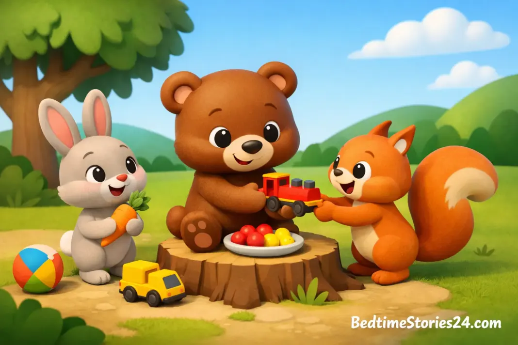 One sunny day, Benny’s best friends — Lily the Rabbit and Max the Squirrel — came to visit. They wanted to play together and have a picnic. Lily brought carrots, and Max brought nuts, but Benny did not want to share his berries or his toy.